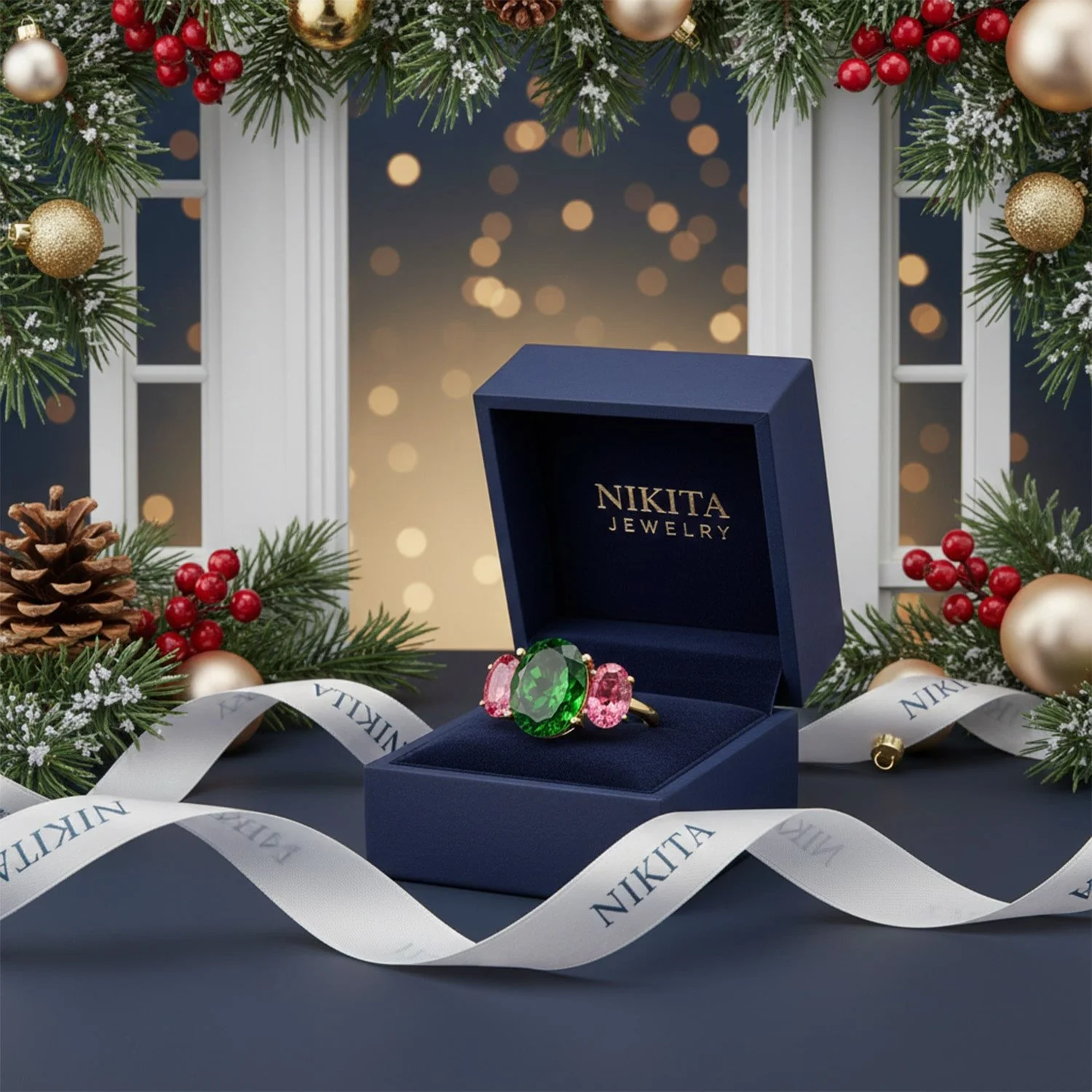 Oval Shape Diopside & Pink Tourmaline 3-Stone Ring
